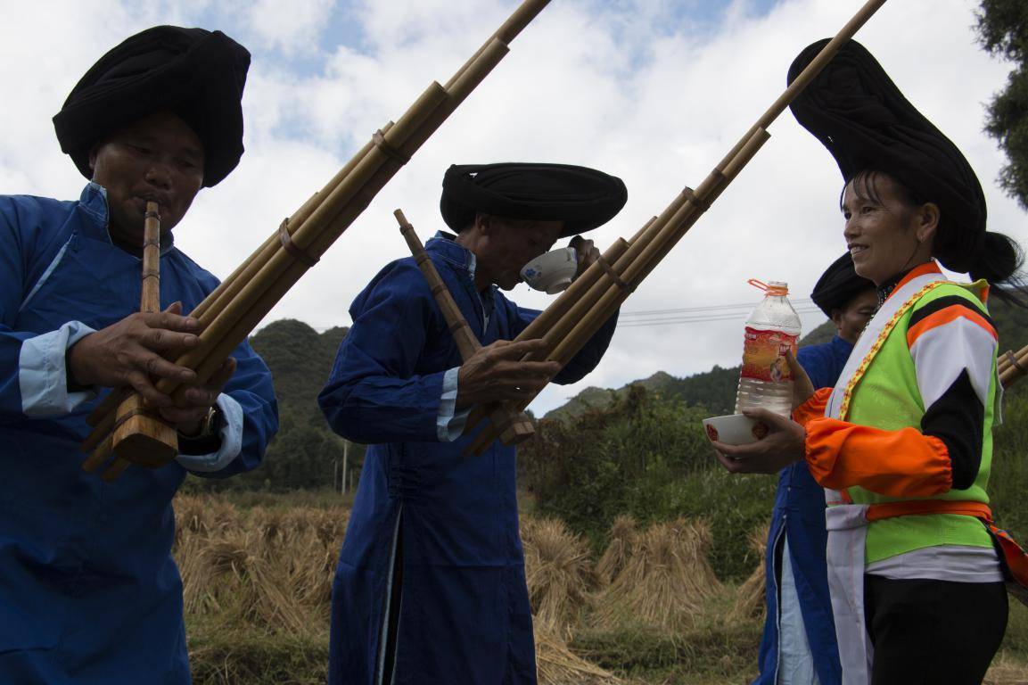 就這樣年復(fù)一年的干活,后來(lái)因?yàn)榇蠹夷挲g大了,干活賣力糧食也豐收了。大哥就想,現(xiàn)在能吃飽了,要讓大家有個(gè)玩的地方和玩的工具。想去想來(lái),他用家里面的葫蘆,把笙管插進(jìn)去,一吹又是有一種味道。所以大哥就把竹管插進(jìn)葫蘆里面,把聲音通過(guò)仔細(xì)調(diào)音制出了蘆笙,六個(gè)聲音當(dāng)時(shí)叫做六笙,后來(lái)才叫做蘆笙。